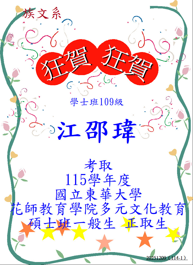 【狂賀!】109級學士班江邵瑋 考取 國立東華大學花師教育學院113學年度多元文化教育碩士班不分組一般生