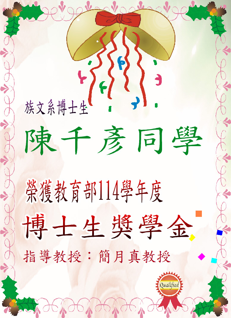 【狂賀!】族文系博士生陳千彥同學榮獲教育部114學年度博士生獎學金